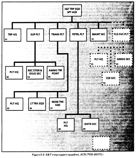 Armored cavalry regiment. Figure 2-6 depicts the organization for water support in the S&T troop support squadron of ACRs (TOE 42077L). The water section in the support squadron has four 600-GPH ROWPUs (48,000/32,000 GPD), twelve 3,000-gallon onion tanks, and two FAWPSSs (6,000 gallons). With this equipment, it can establish two water purification points that can produce 48,000 GPD of potable water from fresh water and 32,000 GPD from salt water. It can store 24,000 gallons when using eight onion tanks. (Four of the 12 onion tanks are used for brine and backwashing operations.)