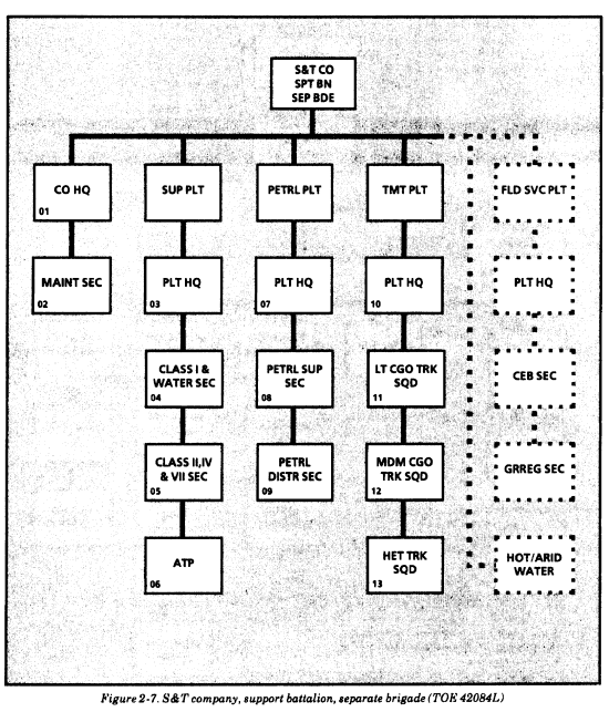 Separate brigades. Figure 2-7 depicts the organization for water support in the S&T company, support battalion, of separate heavy brigades (TOE 42084L). The water section in a separate brigade has four 600-GPH ROWPUs (48,000/32,000-GPD), twelve 3,000-gallon onion tanks, two 3,000-gallon SMFTs (6,000 gallons), and two FAWPSSs (6,000 gallons). With this equipment, it can establish two water purification points that can produce 48,000 GPD of potable water from fresh water and 32,000 GPD from salt water. It can store 24,000 gallons of potable water using the onion tanks. (Four of the 12 onion tanks are used for brine and backwashing operations.) The SMFTs can be used to resupply consumers with no organic transportation and as dry water points. The FAWPSSs can be used to resupply isolated units by air or ground.