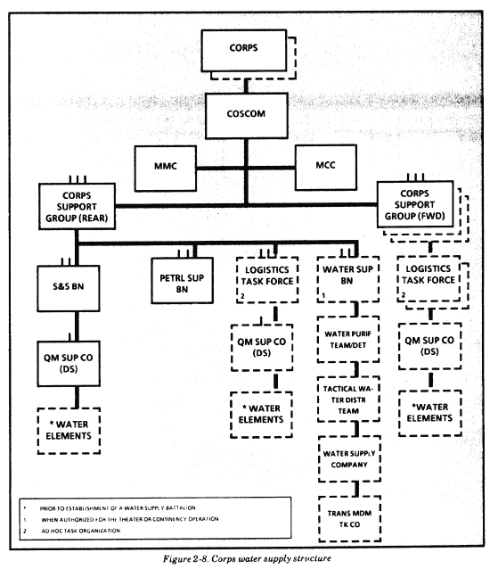 In arid zones where DS water units cannot provide enough water, GSUs provide this capability. Purified water enters the water distribution system from onshore or offshore purification points. Water is stored in collapsible fabric tanks at a base terminal storage facility. It is distributed to other terminals in the TA and forward to the corps area by TWDS. Terminals also provide water support for units nearby on a supply point basis. The petroleum group in the COMMZ and the COSCOM in the corps provide command and control of all GS water assets (see Figure 2-8). These assets include a water supply battalion, water supply companies, tactical water distribution teams, water purification teams and detachments, a water purification barge team, and transportation medium truck companies. These organizations/assets are described in more detail below.