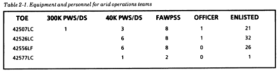In some cases, such as for desert operations, there may be only one water source for the division. It may not be in the DSA. Therefore, its destruction or disruption by threat forces could directly affect operations. This would require the establishment of a GS water supply system. In such a situation, the water supply sections in DSUs will be assigned additional resources (arid operations teams) to operate water storage and distribution systems. These teams can consist of a 300,000-gallon PWS/DS, 40,000-gallon PWS/DSs, and one to eight FAWPSS sets. Purified water will be delivered (by SMFTs) to DSUs from GSUs located in corps and EAC. See Table 2-1 for a listing of equipment and personnel, by TOE, for arid operations teams.