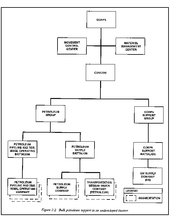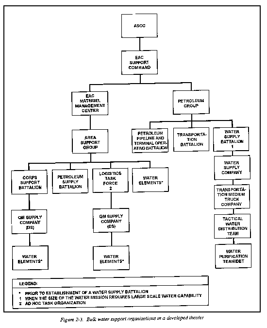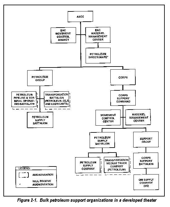 Units within the theater army operate the bulk petroleum and water system in a theater of operations. Figure 2-1 shows the bulk petroleum support organization in a developed theater. Figure 2-2 shows the bulk petroleum support organization in an undeveloped theater. Figure 2-3 shows the bulk water support in a developed theater. Figure 2-4 shows the bulk water support in an undeveloped theater. FM 10-67, FM 10-52, and FM 10-52-1 discuss organizational details.
