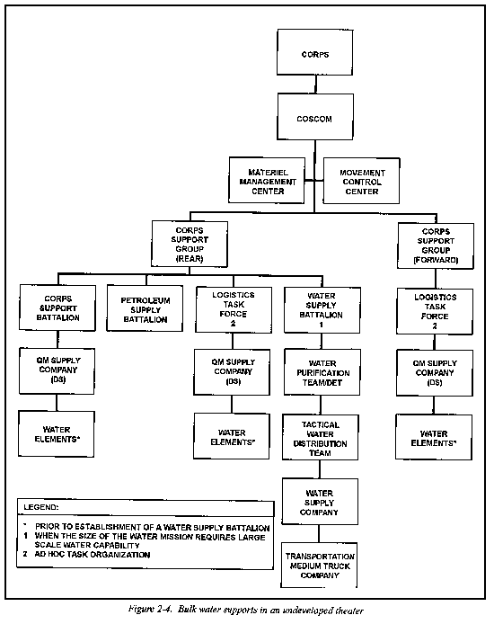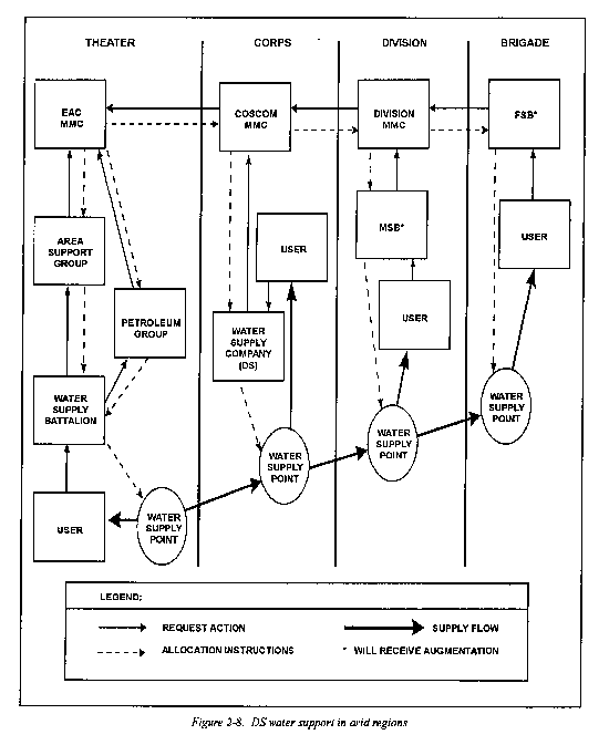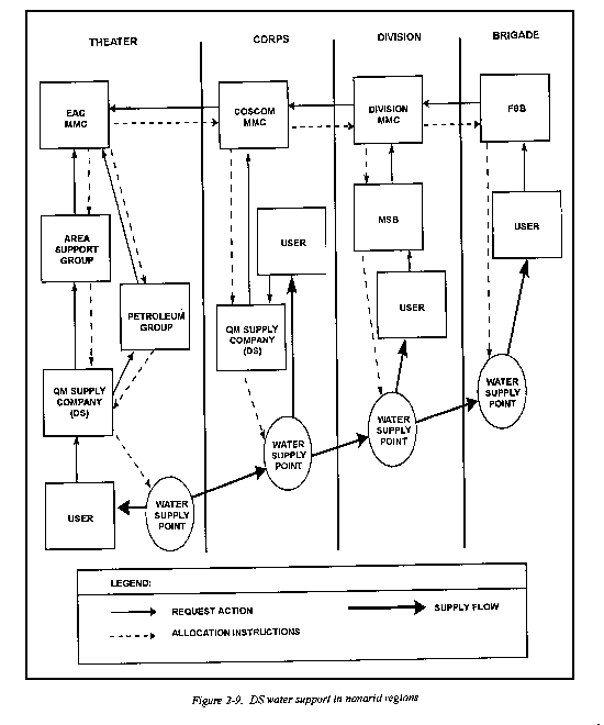 The theater water supply system begins with water production at a water source or the entry of packaged water into the theater. Water sources include deep water sources (ocean, sea or lake) or inground sources (wells, springs, or streams). Medical preventive medicine teams approve the use of all purified and packaged potable water in the water distribution system. In an arid environment, GS and DS water supply units distribute bulk water from the COMMZ to supported units. It is shipped as far forward as possible without changing modes. FM 10-52 gives more information on bulk water distribution. It discusses distribution procedures in a developed and an undeveloped theater. It also discusses supply systems planning, development, and operations. FM 10-52 discusses support by the host nation and bulk water transportation requirements. Figures 2-8 and 2-9 show the flow of requirements in a theater.