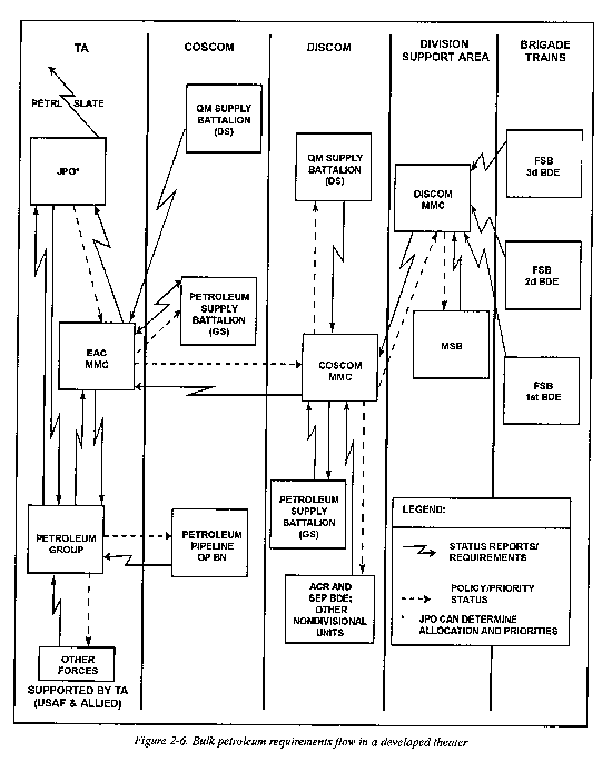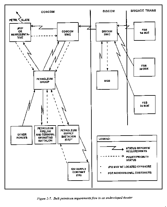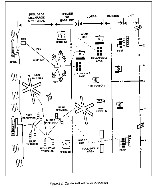 The theater petroleum supply system begins with the receipt of bulk and packaged petroleum products. Packaged products enter the theater at dry-cargo ports or from aircraft at air terminals. Bulk petroleum enters the theater by several methods. Ocean-going tankers may off-load it at marine/tactical petroleum terminals. It is also received in air-landed operations by Air Force transport. LOTS operations use pipelines and hose lines to offload tankers at undeveloped ports into tactical petroleum terminals. GS and DS petroleum supply units then distribute the petroleum products throughout the theater. It is shipped as far forward as possible without changing modes. FM 10-67 details bulk petroleum distribution in developed and undeveloped theaters. Figure 2-5 shows the system for distributing bulk petroleum in the theater. Figure 2-6 shows the flow for bulk petroleum within a developed theater. Figure 2-7 shows the requirements flow for bulk petroleum in an undeveloped theater.