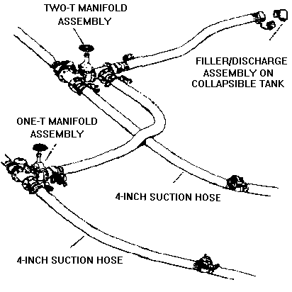 - The 10,000-gallon collapsible tanks. The FSSP normally has six 10,000-gallon collapsible tanks. One hoselines manifold assembly with two T-fittings and one assembly with one T-fitting are used with each tank. The manifold as shown in Figure 23-2, has two rising-stem, double-acting gate valves to control the flow of fuel into and out of the collapsible tank.