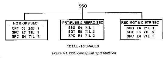 The ISSO's composition should include one officer and about 15 enlisted personnel. Most of the enlisted personnel consist of record telecommunications center operators (MOS 74C). It is expected that the 74Cs will perform a full spectrum of information services tasks. Initially, the ISSO may have to operate with administrative specialists (MOS 71L). The 71Ls over the long-haul should migrate to MOS 74C. The 74Cs will eventually replace some of the 71Ls in activities providing centralized information services. All personnel will require a TOP SECRET clearance.