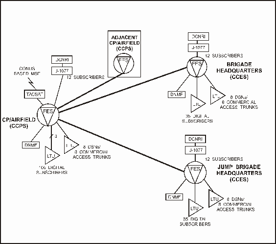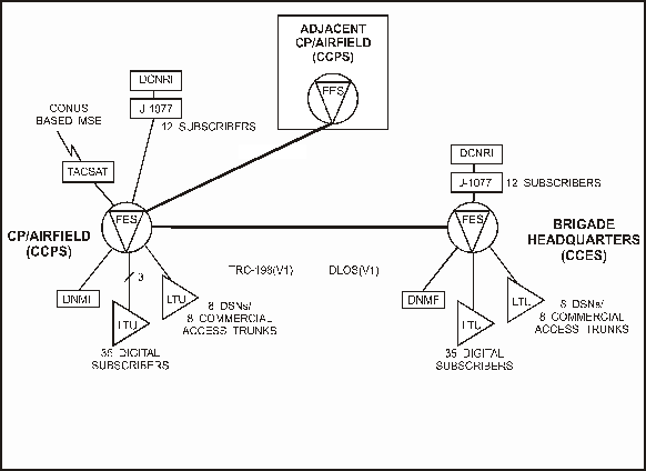 6-18. As the network matures, the CCP supports the deployed brigade headquarters and a jump brigade headquarters and maintains connectivity to an adjacent CP/airfield and to the sustaining base. Connectivity to the adjacent airfield is supported by another CCP and maintained through LOS if possible. Connectivity to the sustaining base is maintained through multichannel TACSAT. (See Figure 6-2.) |