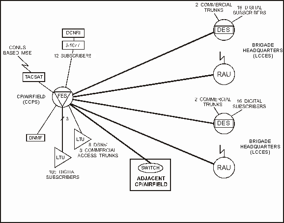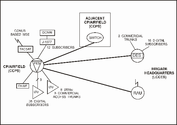 6-21. As the network matures, the CCPS supports two deployed brigade headquarters and two RAUs, located at the brigade headquarters, and maintains connectivity to an adjacent CP/airfield and to the sustaining base. Connectivity to the adjacent airfield is supported by another CP and maintained through LOS if possible. Connectivity to the sustaining base is maintained through multichannel TACSAT. Connectivity to the brigade headquarters is maintained through LOS terminals at the CP/airfield and through the DES at the brigade headquarters. (See Figure 6-5.) |