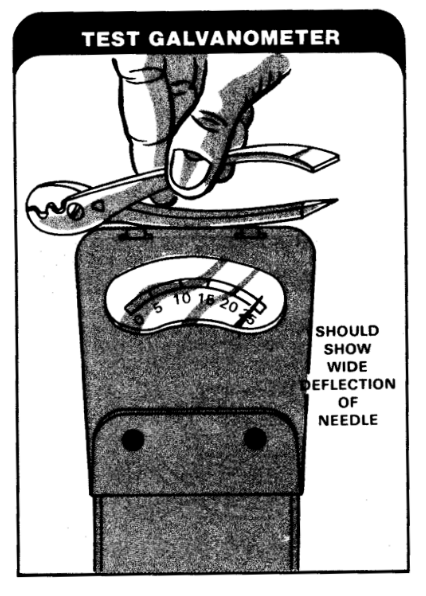 - If the wire has no short when tested, test it for a break. Have the soldier at the charge position twist the bare ends of the strands together. Then touch the two strands at the firing position to the galvanometers/circuit tester posts. That should cause a wide deflection of the galvanometer needle or cause the circuit tester light to come on. If the galvanometers needle does not move or if the light does not come on, the wire has a break--replace it.