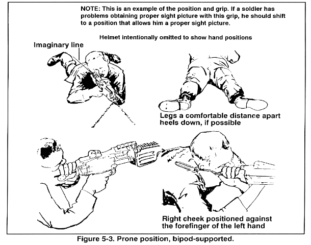 f. The nature of the target and irregularities of terrain and vegetation may require a firer to use a variety of positions to place effective fire on the target. The most stable position for the automatic rifleman is the prone bipod-supported position.