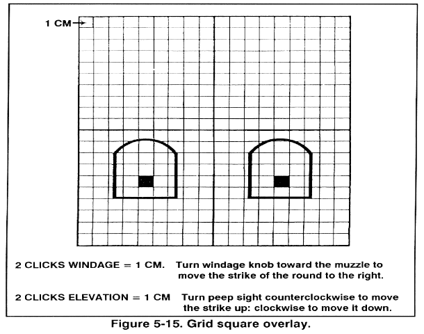 (3) If you miss the 25-meter zero target with the first round but strike the 10-meter machine gun paster target, make a large adjustment with the elevation and azimuth actuators. Continue this process with three-round groups and adjustments until the rounds strike the desired location.