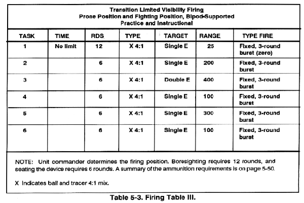 e. Conditions. Firing Table III is for engaging targets out to 400 meters under ideal moonlight or during daylight conditions. If visibility is limited because of a lack of ambient light, commanders may use field-expedient means to identify targets.