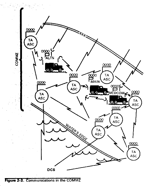 b. The doctrine of a command system superimposed on an area system provides the optimum communications system for a COMMZ (fig 2-2). The command system provides the theater army commander with the means to exercise command and control of combat operations; the area system serves the needs of the combat support and the combat service support elements. The two systems are again complementary because the signal centers at the major commands and major subordinate command headquarters have access to both systems. Thus, when command headquarters move or when portions of either system become inoperative, high precedence traffic being passed over the affected system may be rerouted through operating portions of the other system. Interface points are provided to the DCS to provide worldwide access.