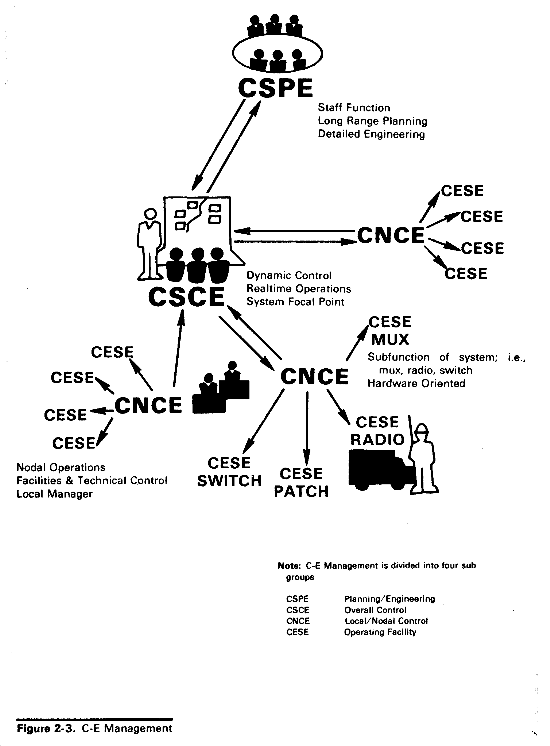 The C-EMS structure uses the tactical communications control facilities (TCCF) concept of operations to provide an informal means (or technical chain) to exercise technical supervision over the operation of the communications systems. Elements of this C-E management structure are assigned to various echelons, with formal ties through the normal chain of command (fig 2-1).