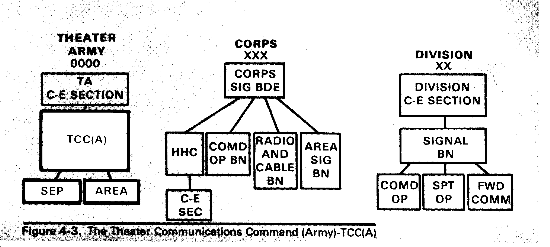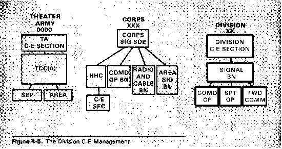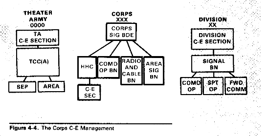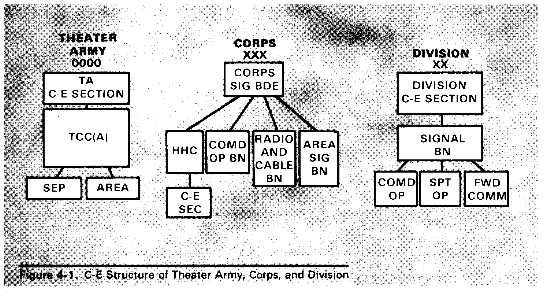 The tactical communications-electronics management system consists of the C-E management assets assigned to each echelon. Each level of command is responsible for integrating its own communications into the system and for supporting the overall system within the theater of operations. The representative organizational structure (fig 4-1) is described in this chapter. Note that this manual discusses only the relationship between theater and theater army C-E management functions. It does not prescribe doctrine for the theater.