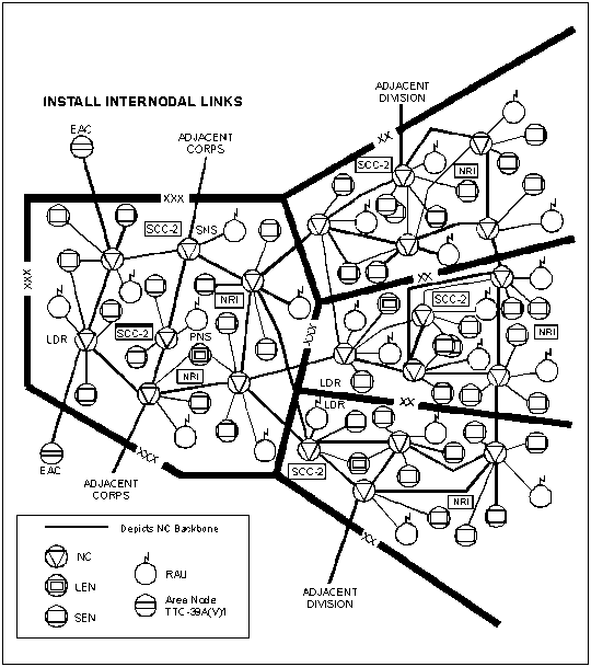 C-9. The NCS serves as an access point for LENs, SENs, RAUs, SCC-2s, and ISYSCON. The NCS is the hub of the MSE node and provides network interface for subscriber access elements. Figure C-3 shows internodal connectivity. It provides automatic subscriber finding features that allow permanent address assignment and removes the requirement of knowing where the subscriber is physically located. It is contained in three S-250 shelters: the switching group, the operations group, and the node management facility (NMF).