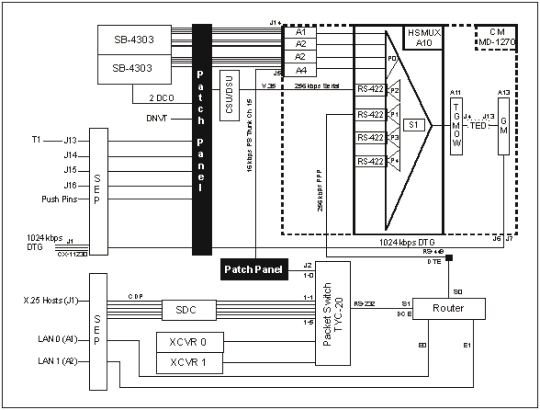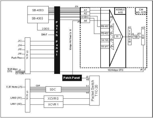 C-45. The HSMUX card replaces the A10 multiplexer/demultiplexer card in the CM, and it provides four additional serial ports. The back plane of the A10 card is not wired for access outside the CM. The individual Diphase Loop Modem-A (DLPMA) card provides access to the patch panel for the original SEN trunks. A high-speed balanced interface card (HSBIC) provides access to the new high-speed ports without modifying the CM or the line terminating unit. The HSBIC replaces one of the DLPMA cards in the CM. The HSBIC terminates two of the four HSMUX ports and extends them to the patch panel instead of the four voice trunks. These serial circuits are then patched over to the line side of the patch panel so the circuit can be extended over 26-pair to a J-Box. Figure C-9 shows the HSMUX/HSBIC SEN signal flow.