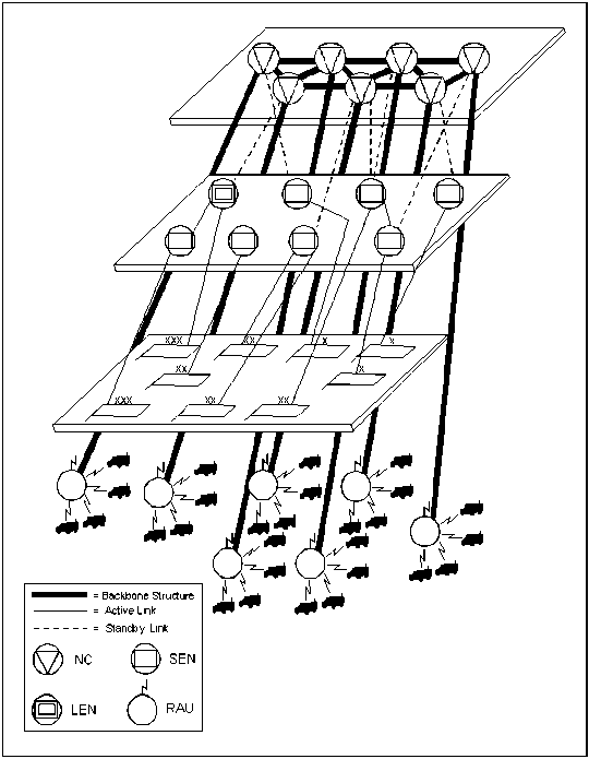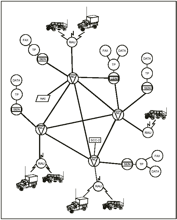 C-4. Figure C-2 shows the MSE architecture divided into three layers. The upper layer is the backbone structure that consists of interconnected NCs. The middle layer consists of LENs and SENs that provide CPs with network access. The bottom layer consists of static (wireline) and mobile subscribers. Up to 264 SENs and 9 LENs can deploy to support the corps. Typically, a SEN serves a brigade headquarters, separate battalion, or CP. Each of the 112 radio access units (RAUs) (13 in each division and 47 in the corps) support from 20 to 25 mobile subscribers.