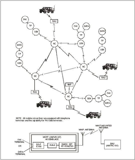 C-32. MSE network users gain mobile access using the MSRT (AN/VRC-97) through the RAU by affiliating onto the network. MSRTs can receive or send voice, facsimile, or data traffic. The planning range between the MSRT and RAU is 15 kilometers (9.3 miles). Terrain and weather will affect the actual range.