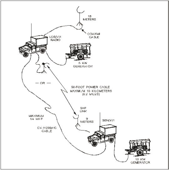 C-17. Deployment of the LOS assemblages must be considered to minimize the radio signature of the node. As an internodal link, the LOS(V)3 can deploy on hills up to 400 meters from the node via CX-11230A/G cable. If the distance exceeds 400 meters, the SHF radio link can be used up to 10 kilometers (Figure C-5). SHF radio distribution to the NCs and LOS assemblages allows for remoting 50 percent of the radio links.
