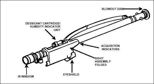 3-9. Launch Tube Assembly. The launch tube assembly (figure 3-3) is a fiberglass tube that houses the missile. It provides the means to transport, aim, and fire the missile. The launch tube provides the main support for all other parts of the weapon round. Both ends of the launch tube are sealed with breakable disks. The front disk is transparent to IR radiation, allowing the radiation to reach the heat-sensitive missile seeker. The front disk breaks outward at launch, and the aft disk blows out as the launch motor ignites. A desiccant cartridge and humidity indicator measures the humidity level in the sealed tube. The hinged sight assembly attached to the launch tube allows the gunner to sight the weapon, determine target range, superelevate the weapon, and hear the audible tones through the acquisition indicators. The eye shield attached to the sight frame protects the gunner's left eye during launch. The launch tube is destroyed and discarded after the missile is fired.