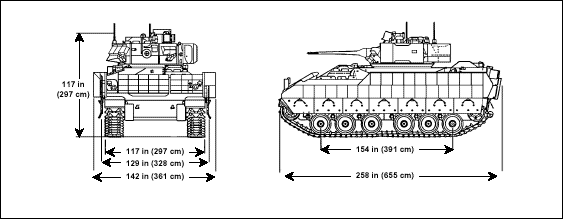 Weight (less fuel, crew, and OVE): M2A2: 43,500 LB (19,732 kg) | |