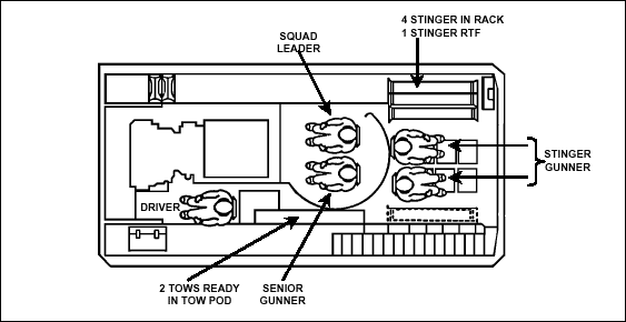 3-26. The BSFV is a fully tracked, diesel-powered, lightly armored vehicle. The turret on the BSFV is equipped with a 25mm main gun, 7.62mm coaxial machine gun, externally mounted tube launched, optically tracked, wire guided (TOW) missile launcher, and two M257 smoke grenade launchers. The fire control system features an integrated day or night sight incorporating a thermal-imaging infrared device. The recommended load for missiles on the BSFV is six Stinger and five TOW missiles. Two TOW missiles are ready and three stored. All six Stingers are stored in a ready rack. Five soldiers man the BSFV (figure 3-7).
