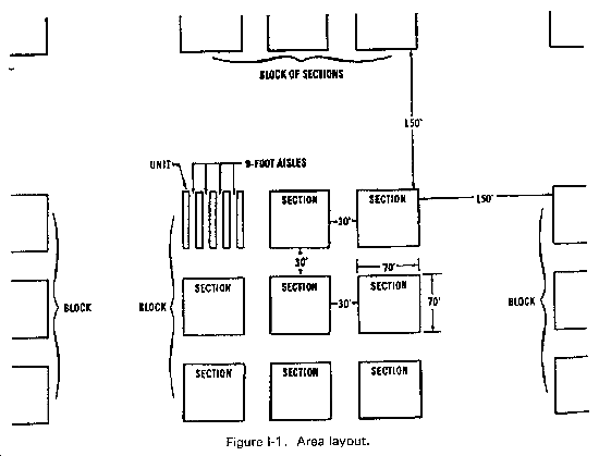 Set up, in the area, a separate stocking area for each product and type of package. If you have an area for each, you can easily inventory and control the stock. You are also less likely to incorrectly identify the product. Use a block system to separate large amounts of stored supplies so that the entire stock of one product is not lost if there is an enemy attack or a fire. Plan the exact layout according to local conditions and safety requirements (See Appendix F, Safety, for guidance).