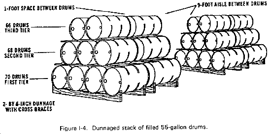 - Place a second tier on top of the first, and nest each drum between the two drums below it. Ensure that the bungs and vents are in a horizontal line and below the surface of the liquid. If you stack the drums in a pyramid (figure I-4), position them vertically, center them in the upper tier directly over those in the tier below.