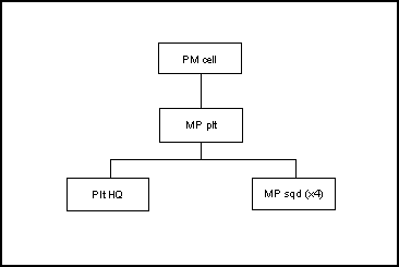 8-2. MP support to separate brigades is provided by a four-squad MP platoon organic to the brigade HHC. A separate PM cell within the brigade HHC serves as the C2element for the platoon (see Figure 8-1 below). Support to the platoon and the PM section for maintenance, supply, mess, and communications is provided by the brigade HHC. Since the platoon and PM section have no organic support, the MP leadership must perform close coordination for this support. However, the MP platoon must compete with other brigade HHC assets for priority of repair for weapons, vehicles, and communications equipment.