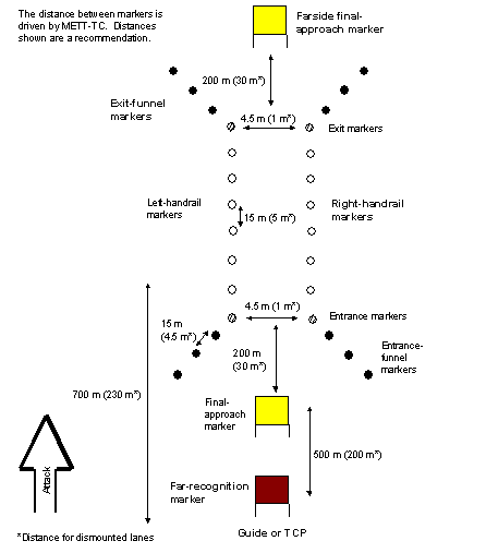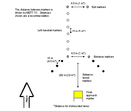 - Entrance-funnel markers are placed at 15-meter intervals for mounted forces and 5-meter intervals for dismounted forces. They are placed diagonal to the lane entrance to form a 45-degree V as shown in Figure 3-1 .