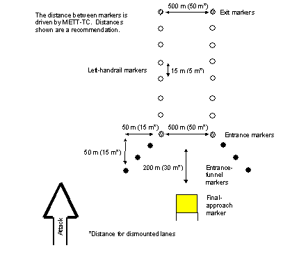 - The final-approach marker is centered on the lane and placed at least 200 meters from the lane entrance for mounted forces. For dismounted forces, the nature of the attack may preclude using a final-approach marker initially. Place a final-approach marker 30 meters from the entrance as soon as the mission allows. Commanders modify the recommended distance for the final-approach marker based on the terrain and the visibility.