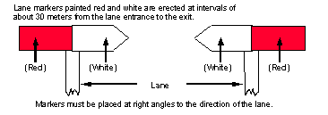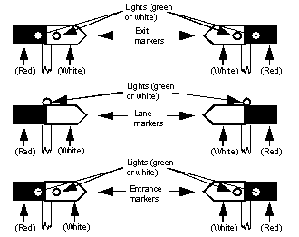 3-29. When the lane width has been expanded to 10 meters, entrance, exit, right-handrail, funnel, and final-approach markers are replaced on the return lane. All markings are the same as described in previous paragraphs. Figure 3-3 shows a full lane-marking pattern.