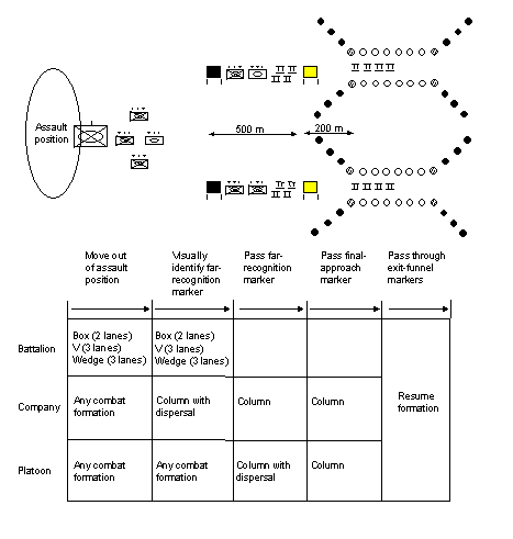 Figure 3-4 shows how formations at various levels may change to efficiently pass through lanes. A battalion TF initially moves from its assault position in a box, V, or wedge formation depending on the number of lanes being used.