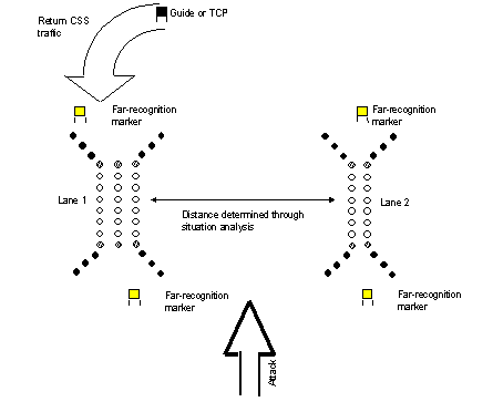 3-33. Far-recognition and final-approach markers in a standard lane-marking pattern help commanders smoothly change assault and follow-on forces into a column formation before passing through the lane. In most cases, the situation should allow the unit to move in a column formation from the outset; however, the enemy situation and the terrain may demand that forces remain dispersed as long as possible. Far-recognition, final-approach, and entrance-funnel markers are used to trigger commanders to alter their formations.