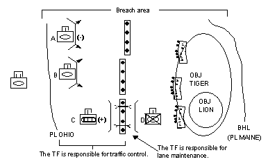 3-38. Figures 3-6 through 3-9 show how a unit defines responsibilities for lane maintenance and traffic control. In this example, a TF breaching operation is being conducted. Teams A and B provide suppressive fires as the support force, Team C reduces tactical obstacles as the breach force, and Team D seizes OBJs LION and TIGER as the assault force. The brigade intends to pass an armored TF through obstacles as the first element of the follow-on forces once the TF has cleared a route through the breach area. Note that the initial-lane requirement to pass Team D (the assault force) is one vehicular lane, but the breach force breaches a second lane to pass follow-on forces (an armored TF).