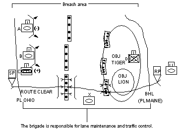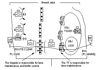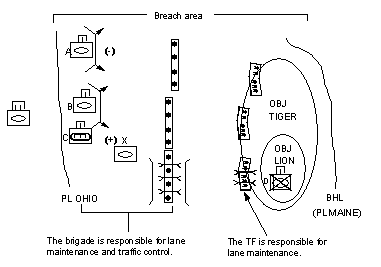 Once the assault force has seized its objective and reported that it has established a clear route up to the BHL (PL MAINE), the brigade begins to pass the follow-on TF through the breach area. At this point, the brigade controls traffic throughout the breach area. The TF is responsible for maintaining lanes in the protective obstacles ( Figure 3-8 ).