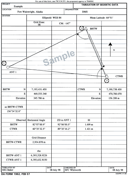 C-1. Tabulate data (known and field) for a two-point intersection on DA Form 1962 (Figure C-2) or on a blank piece of paper with an identifying heading. Include the following information: