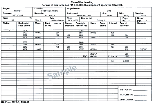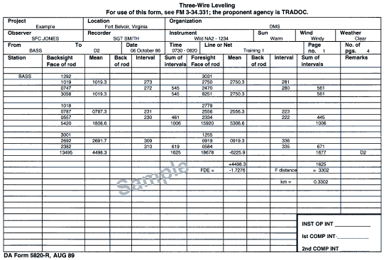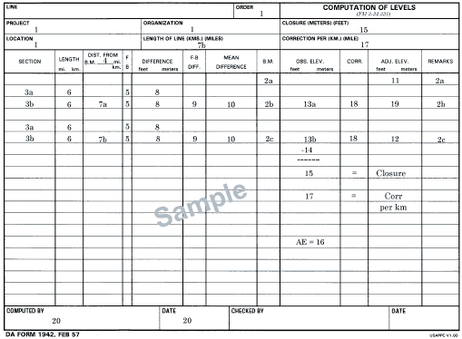 C-14. Compute a level line on DA Form 1942. Refer to Figure C-16 when working steps 1 through 20 (the step numbers correspond to the numbered blocks). Figure C-17 shows a completed DA Form 1942. Data will be required from the field notes (DA Form 5820-R) shown in Figures C-18 through C-21.