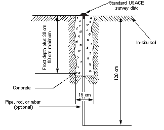 - Type G monument. This classic, standard monument is made completely of poured concrete with a disk set in the top of the concrete (Figure 3-1). These procedures and dimensions are for a second- or higher-order monument. A Type G monument is constructed by excavating a hole that is 15 centimeters in diameter and 60 centimeters deep. In areas where the maximum frost depth is greater than 60 centimeters, the hole should be 30 centimeters below the frost depth. The disk should be driven onto a pipe, a rod, or a number 5 rebar that is 120 centimeters long. The pipe, rod, or rebar assembly is then driven into the center of the hole until the top is slightly above the surface. The hole is then filled with concrete, which must not cover the disk. The use of pipe, rod, or rebar is optional. The disk may be pushed directly into the fresh concrete, but a magnet must be placed in the concrete if the bar is omitted.