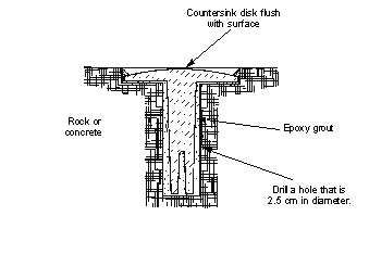 - Type C monument. Sound bedrock is the most desirable location for a BM, as illustrated by Figure 3-2. It provides the most stable setting in terms of underground activity and potential disturbances. Always use bedrock when a suitable outcrop exists. Use a star drill to make a hole about 2.5 centimeters wide and 6 centimeters deep to receive the shank of the marker. Fill the hole with epoxy resin and insert the disk, with the resin slightly built up around the edge. When a solid bench or ledge is covered with a few feet of top soil, the subsurface mark should be in the ledge and a concrete monument should be set above it to protrude above the surface.