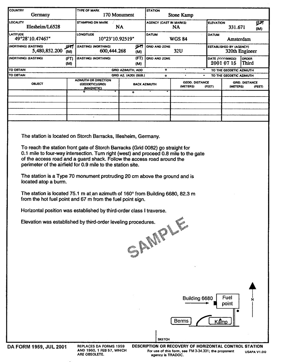 3-43. The recon party will prepare a description and sketch of all newly established permanent and temporary stations and all stations recovered. Stations recovered, but not used, must also have a description completed. The description and sketch will be done on DA Form 1959 (Figure 3-4) or in an appropriate field book. The field record is done in free hand using vertical gothic lettering. A final DA Form 1959 should be typed and kept with the official records.