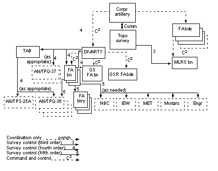 9-9. Each artillery commander is responsible for establishing common control throughout his AO. The FSCOORD must disseminate to the appropriate artillery battalion HQ the established accuracy requirements in survey terms. Additional requirements or guidance derived by the FSCOORD must also be communicated. This should be done through face-to-face coordination or through the S3. The survey officer must be included in this coordination and should advise the FSCOORD and/or the S3 on the current survey capabilities and limitations.