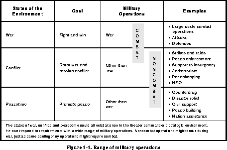 Douglas MacArthurThe United States (US) Army, facing a wide range of potential enemies, is prepared to fight under diverse conditions, climate, and intensity with its sister services and its allies. The range of military operations includes the diverse environments of peacetime, conflict, and war, which are not precise, clearly defined, or exclusive of themselves. Figure 1-1 shows the relationships between peace, conflict, and war.