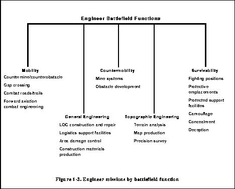 The five primary engineer functions in the TO are mobility, countermobility, survivability, general engineering, and topographic engineering. Figure 1-2 shows the types of engineer missions by battlefield function.