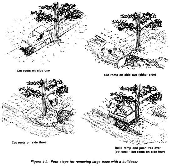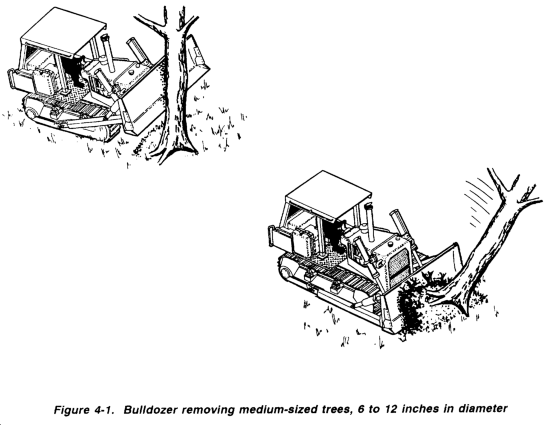 Medium Trees, 6 to 12 Inches in Diameter. To push over trees that range from 6 to 12 inches in diameter, set the blade of the bulldozer as high as possible to gain added leverage (Figure 4-1). As the tree falls, the bulldozer is backed up quickly to clear the roots. With the blade lowered, the dozer travels forward again and digs the roots free by lifting the blade. The felled tree is then ready for removal to the spoil areas.