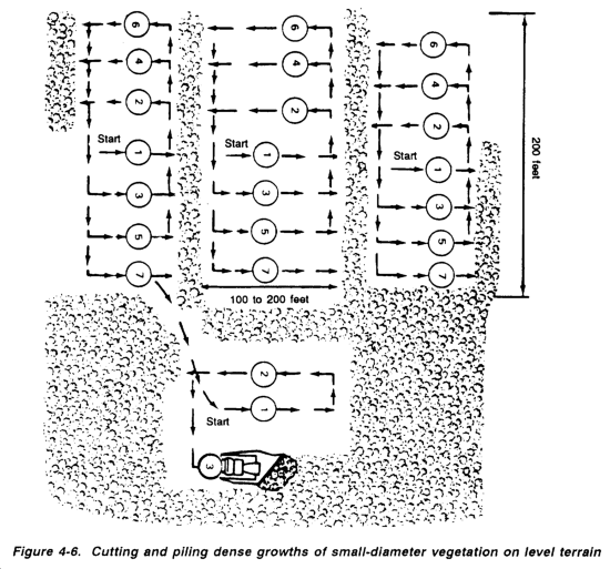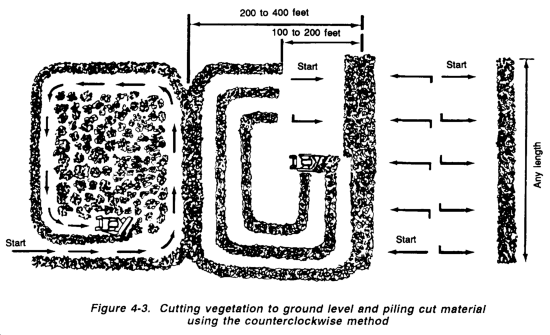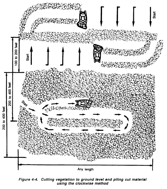 The area of vegetation should be laid out as shown in Figure 4-6, with the operator working in patches, from inside to outside in a counterclockwise direction and at right angles to the windrows. Sweeping and piling the resulting debris can be accomplished much faster when tractors are used in teams traveling abreast.