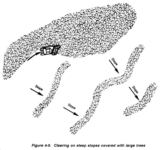 - When the tractor can move forward almost continuously, it shears to ground level anything in its path, Fast production can be obtained by laying out long areas (200 to 400 feet wide) that can be cut from the outside toward the center in a counterclockwise direction. The cut material then slides off the trailing (right) end of the tree-dozer mounting and leaves the uncut area free of fallen debris. The windrows are placed lengthwise on the borders of the areas. Piling is done by sweeping with the tree-dozer mounting. Sweep a blade width at a time. Work from the center of each area, at a right angle to the border (Figure 4-3).