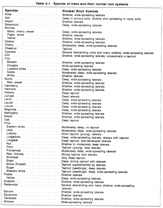 Temperate forests contain both softwood and hardwood trees. Hardwoods are dominant where the soils are old, deep, and fertile. Softwoods are dominant where the soils are young, shallow, and less fertile. The density of growth in these forests varies with topography and local climate conditions. Bogs are common in cold region, softwood forests. Bogs present a hazard to construction equipment during the clearing operations. Root systems vary according to geologic conditions and species. The types of root systems typical of various species are listed in Table 4-1.