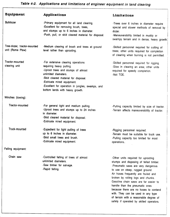 The use of engineer equipment is the most rapid and efficient method of clearing. The use of such equipment is limited only by un-usually large trees, stumps, and terrain that decrease the maneuverability of the equipment and increase maintenance requirements. This type of equipment includes bulldozers; tree-dozer, tractor mounted units; tractor-mounted clearing units; winches; power saws; rippers; and motor graders. In addition, pioneer tools are used for some clearing operations. Table 4-2 summarizes the limitations and proper applications of engineer equipment in clearing operations. Use production rates of equipment under normal operating conditions for determining the total time required for the job. Clearing rates are discussed in FM 5-434. Limitations and applications for each type of equipment follow.
