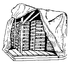 8-22. Sacked cement that will be stored for a long time should be in a warehouse or a shed that is as airtight as possible. Ensure that the floor of the shed is above ground, and close up all cracks in the walls. Store the sacks close together to reduce air circulation; however, do not stack them against a wall. Stack cement sacks on a raised, wooden platform and cover them with tarpaulins ( Figure 8-1 ). Note that tarpaulins extend over the edge of the platform to prevent rain from collecting on the platform and reaching the bottom sacks. Use tarpaulins for protection against moisture even when storing a small amount of cement for a short time. Ensure that the concrete mixer is located near the storage shed.